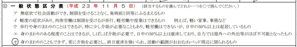 - 2級:エ 身のまわりのある程度のことはできるが、しばしば介助が必要で、日中の50%以上は就床しており、自力では屋外への外出等がほぼ不可能となったもの