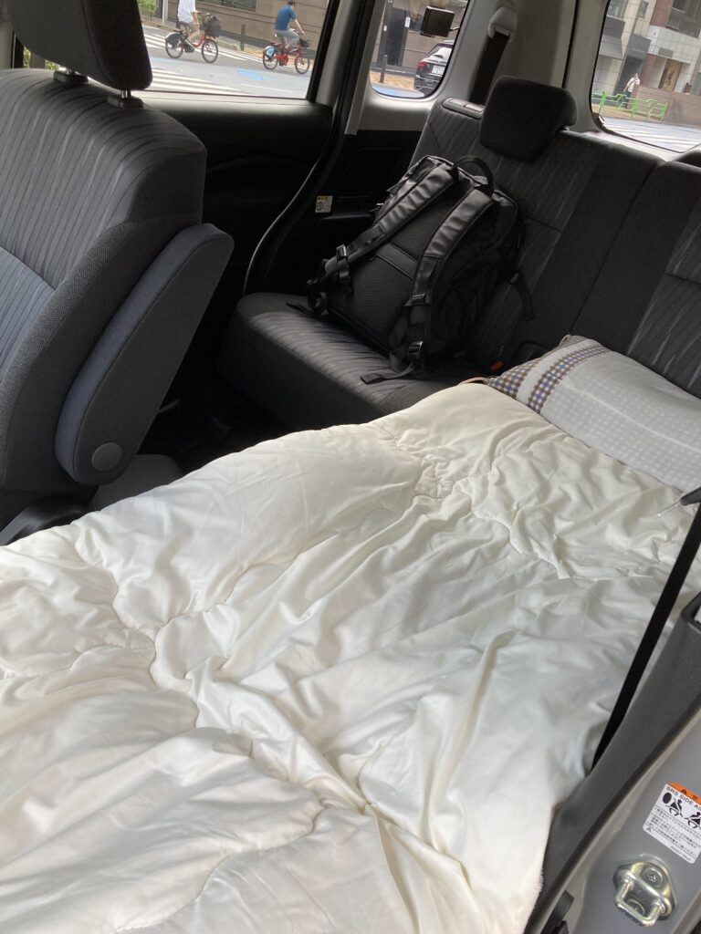 - 車内はフルフラットにして、完全に横になって移動